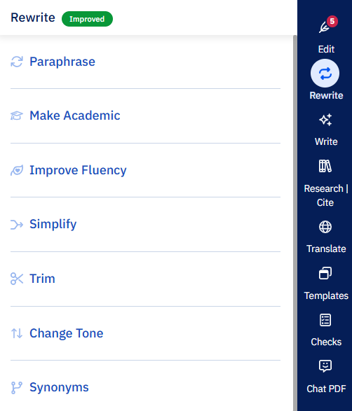 - Synonyms is now available under the Rewrite menu, along with Paraphrase, Trim, and Make Academic.